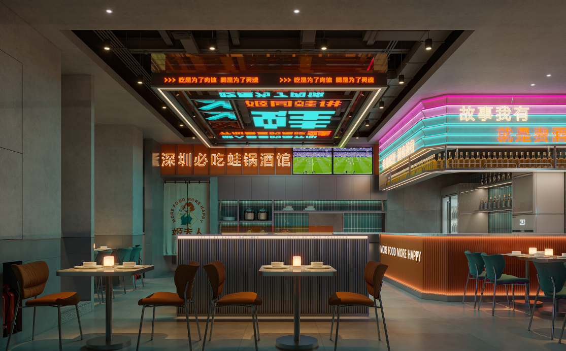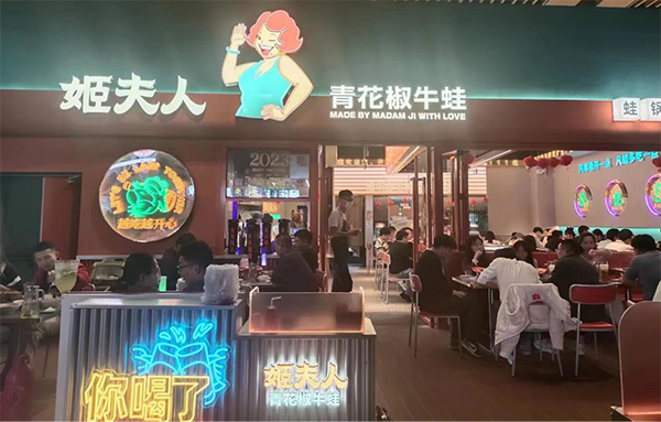 姬夫人深度研判市場(chǎng)趨勢(shì),以“蛙鍋、燒烤、酒館”結(jié)合的概念橫空出世,通過(guò)蛙+燒烤+酒的產(chǎn)品線設(shè)計(jì),搭配凸顯氛圍和體驗(yàn)感的裝修風(fēng)格,在品牌價(jià)值觀輸出上,倡導(dǎo)開(kāi)心文化,幫助城市的年輕精英們放松心情快速釋壓,充分滿足了當(dāng)代年輕消費(fèi)主力軍的全新體驗(yàn)需求。