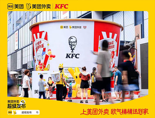 此外,美團(tuán)外賣(mài)“超級(jí)發(fā)布”也為肯德基提供了傳播策略方案,通過(guò)線下打造“最大全家桶”熱搜事件,在上海五角場(chǎng)萬(wàn)達(dá)人流量密集地搭建肯德基“歐氣大大桶”,為肯德基打造“有趣年輕”的品牌形象,吸引大量年輕用戶線下打卡線上種草,為更多消費(fèi)者們建立全新的品牌認(rèn)知,幫助品牌再度夯實(shí)年輕化心智。熱搜事件成功在微博平臺(tái)獲得2億+曝光量及20w+互動(dòng)量,有效引起了老客群體的高度關(guān)注和用戶的自傳播。