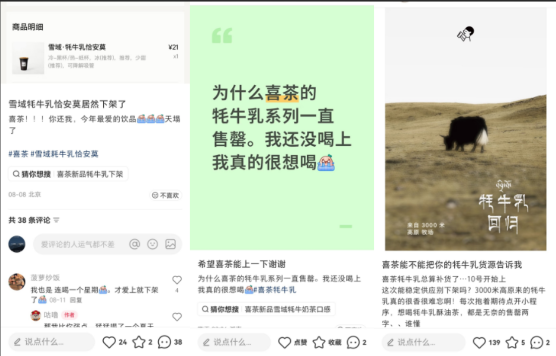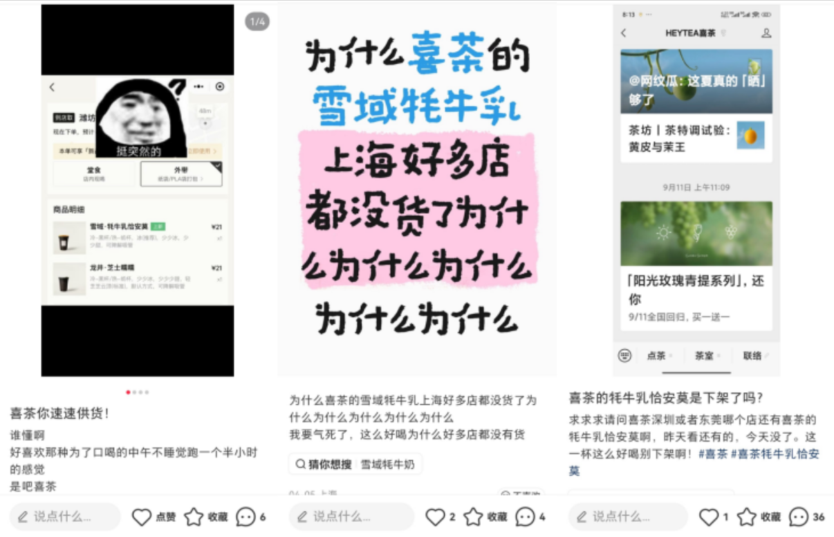 這也進(jìn)一步帶動了「雪域·牦牛乳恰安莫」的售罄情況,越來越多的消費者發(fā)帖詢問“「雪域·牦牛乳恰安莫」又?jǐn)嘭??”?0月22日,喜茶官方回應(yīng):原料牦牛乳冬季產(chǎn)量變化,近期可能會有短暫售罄的情況,目前正在積極補貨中。