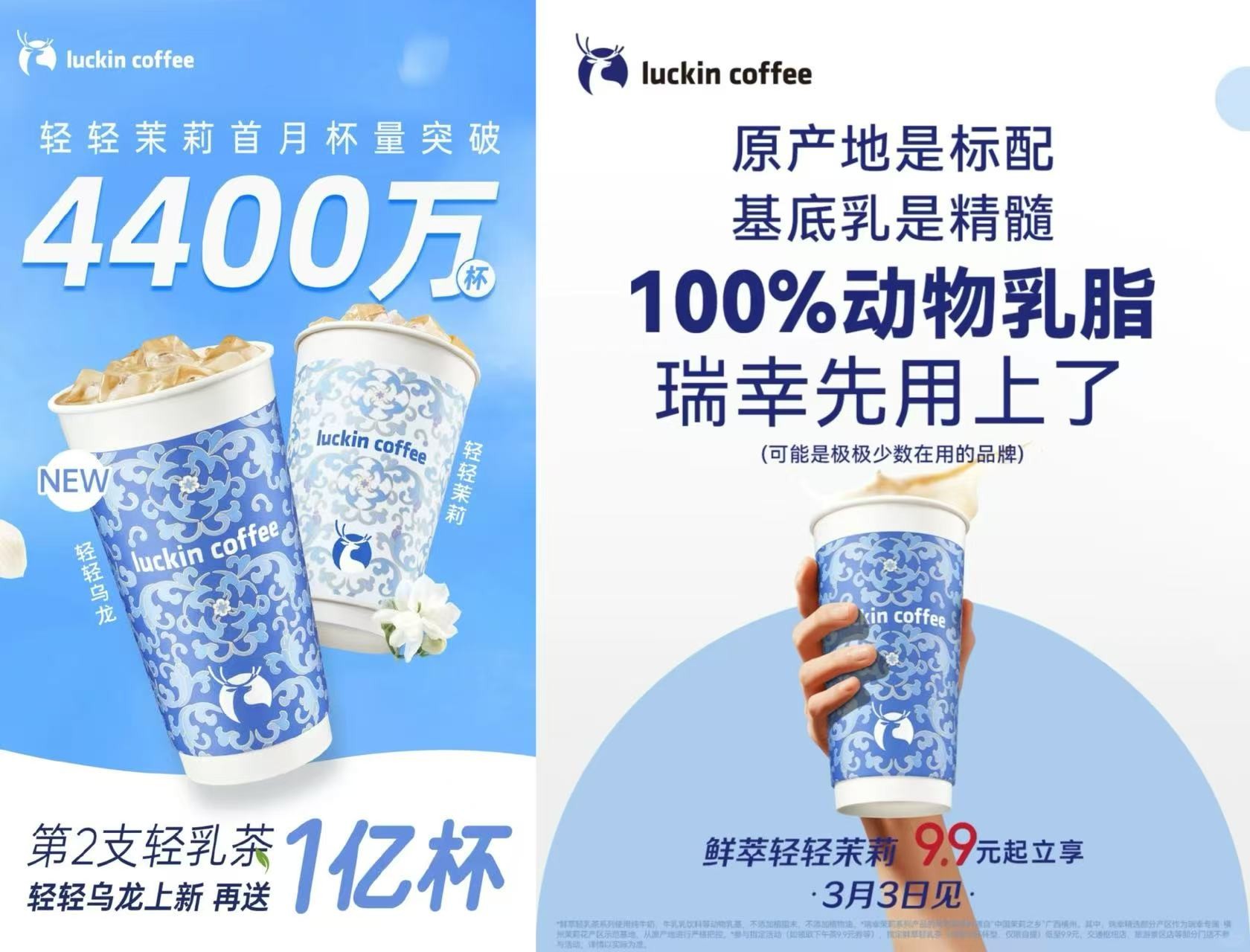 憑借成熟的門店網(wǎng)絡和供應體系,咖啡渠道也開始公開“搶人”。去年,瑞幸高調(diào)官宣劉亦菲為茶飲首席推薦官,并推出名為“輕輕茉莉”的茶飲和霸王茶姬的拳頭產(chǎn)品“伯牙絕弦”正面對壘。次日,瑞幸開啟“送1億杯9.9下午茶”的活動,而市面上與其配料相似的奶茶售價卻普遍在二、三十元的價格區(qū)間。