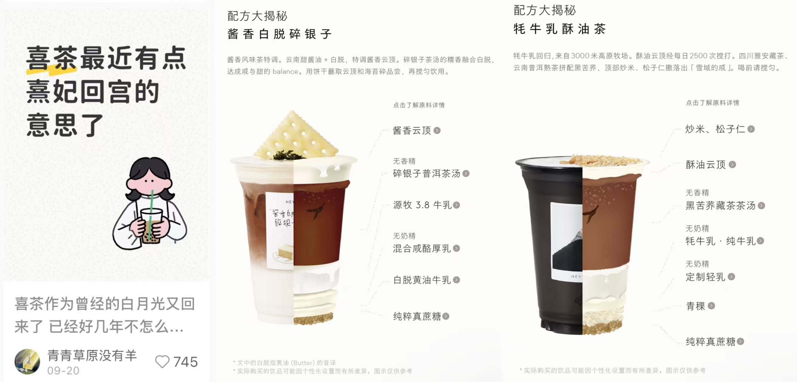 以喜茶為例,調(diào)轉(zhuǎn)方向后,喜茶新品更加關注原料的獨特性(如牦牛乳、黃油牛乳、藏茶、炒米、羽衣甘藍等)和飲品的健康屬性(選擇新鮮蔬果、純動物乳脂等原料,踐行四真七零的品牌承諾)。一系列舉措下,喜茶新品重回風味巔峰,被消費者評價為“喜妃回宮”。
