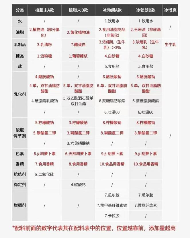 老爸測評以必如冰博克為標桿橫向?qū)Ρ戎仓┡c非氫化基底乳成分,直指此類原料以植物油脂為主料,含奶量低、添加劑多