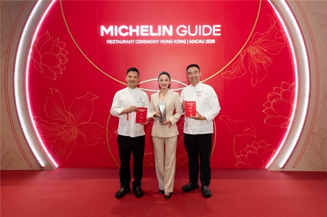 圖片說(shuō)明:淮揚(yáng)曉宴高級(jí)主廚肖飛(右)、淮揚(yáng)曉宴餐廳部長(zhǎng)葉惠娟及澳門(mén)四季酒店中餐廳行政總廚何鑫濤(左)出席《香港澳門(mén)米其林指南2026》典禮。