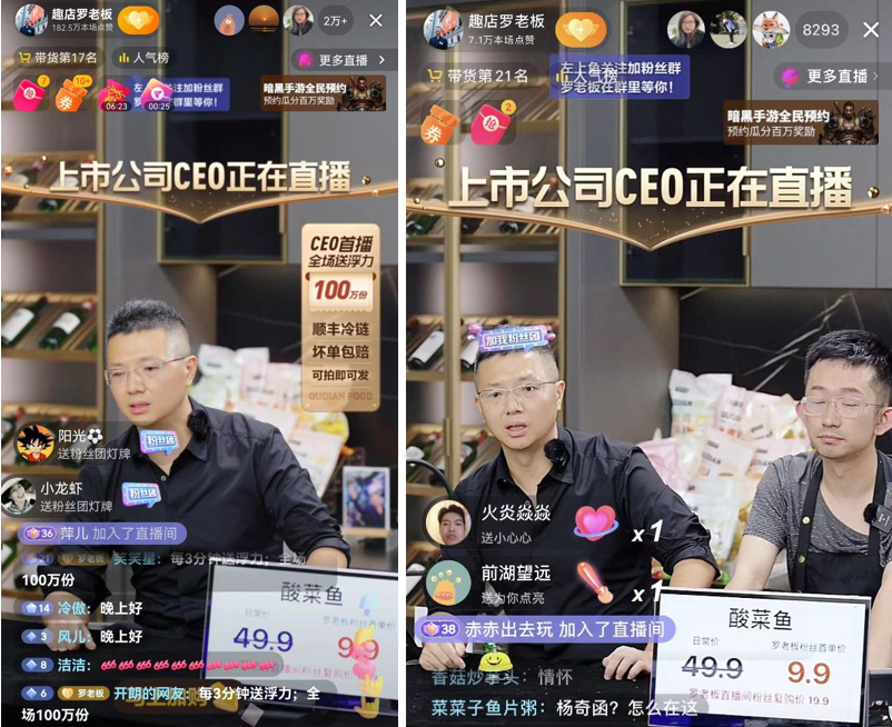 消費層面,趣店的直播間里,老板和明星輪番上場推銷“1分錢酸菜魚”。單場累計超過9000萬的觀看人次,達到2.52億元的銷售額,刷新了人們對預制菜的認知。