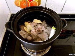 4、砂鍋內(nèi)放入紅豆、薏米、排骨、蔥、姜、料酒,倒入適量熱水。用大火燒開,撇去浮沫。再開用小火煮約20分鐘。