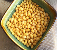 1、將干黃豆放入大碗中沖洗一下,用涼水浸泡2小時以上至泡發(fā)成長圓形的豆。