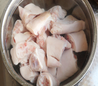 1、豬腳上的毛一定要去除干凈,最好是賣家已處理過的凈豬腳,并請其剁好塊。將豬腳先泡出血水,再煮一下更加去除雜味,再用涼水沖涼后可使皮肉筋道有嚼頭。