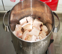 3、將豬腳撈出,再沖洗干凈,放入煮鍋中,倒入適量冷水,放入大料、1小勺料酒,加蓋后大火煮開。
