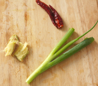 5、蔥切長段、姜切大塊后用刀背拍一下。