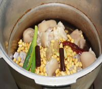 6、將煮過的豬腳撈出,用涼水沖洗至涼,放入高壓鍋中。再將泡好的黃豆撈出,沖洗干凈后也放入高壓鍋中。再放入蔥、姜、干紅椒、山楂,加入適量水,水量約沒過食材底部即可。點火,大火煮開。