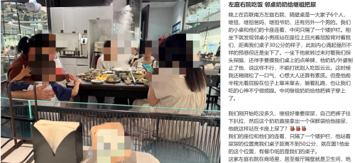 還有網(wǎng)友爆料,在左庭右院吃飯時,隔壁桌是一大家子6個人,自己剛開始吃沒多久,隔壁桌小孩想尿尿,孩子的奶奶直接拿出一個保鮮袋為他接尿,小孩直接站在卡座上方便。網(wǎng)友稱,他們的座位與隔壁桌連著,只隔了一個矮護欄,小孩尿尿的位置離其不到50公分。
