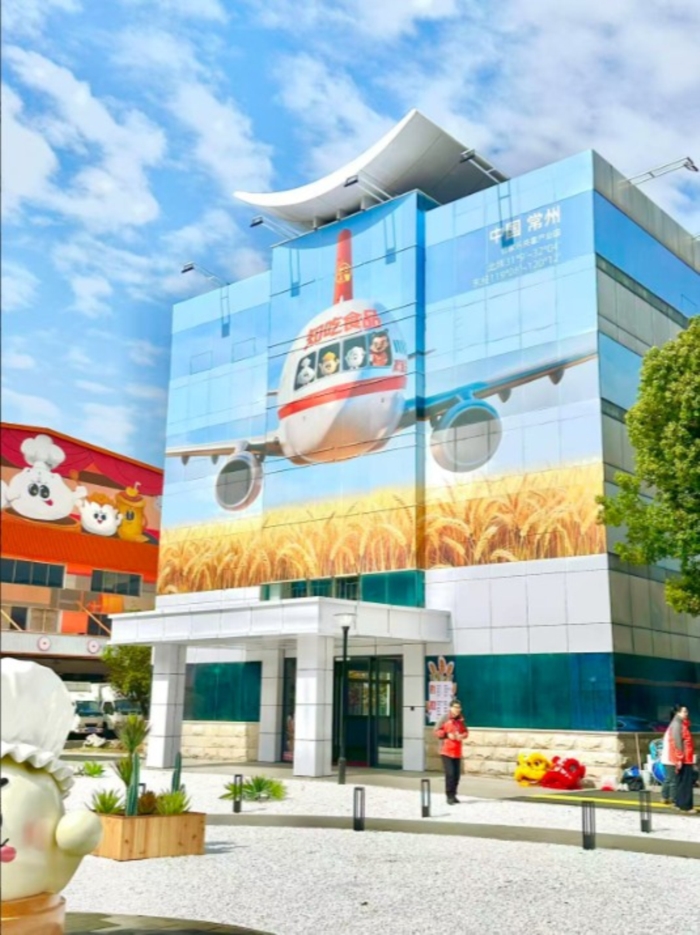 與傳統(tǒng)工廠的工業(yè)感不同,這里更像一座溫暖的“面點(diǎn)童話工廠”。明亮的橙色主調(diào)與生動(dòng)的各類面點(diǎn)Q版形象融于各處,從屋頂矚目的“會(huì)呼吸的包子”雕塑、彰顯出海抱負(fù)的巨幅海報(bào),到可互動(dòng)擊掌的包子裝置、創(chuàng)意面點(diǎn)瀑布,遍布廠區(qū)的主題墻繪與趣味燈繪、地繪——每一處設(shè)計(jì)皆充滿故事感與親和力,讓生產(chǎn)空間可觸摸、可共鳴。